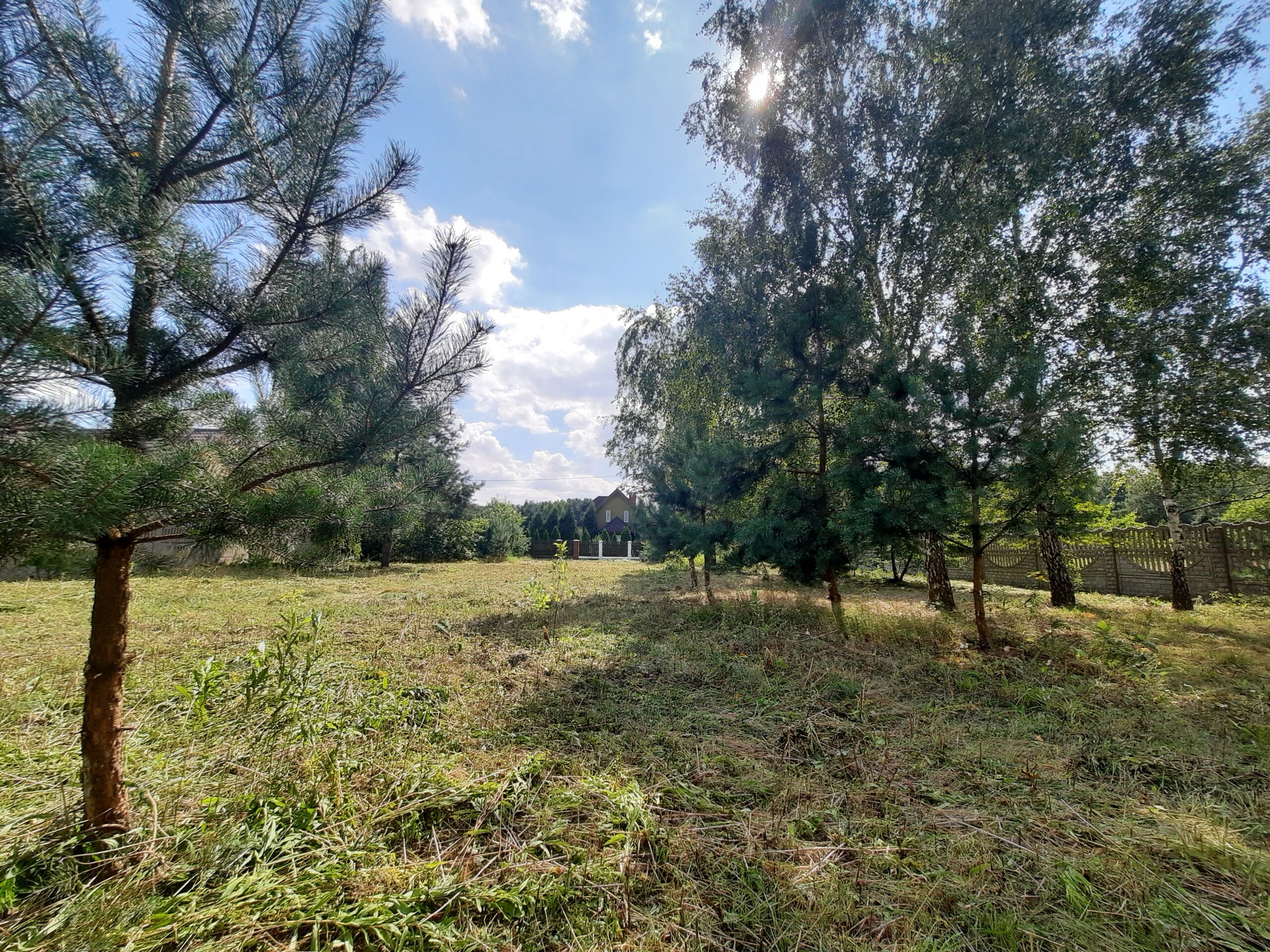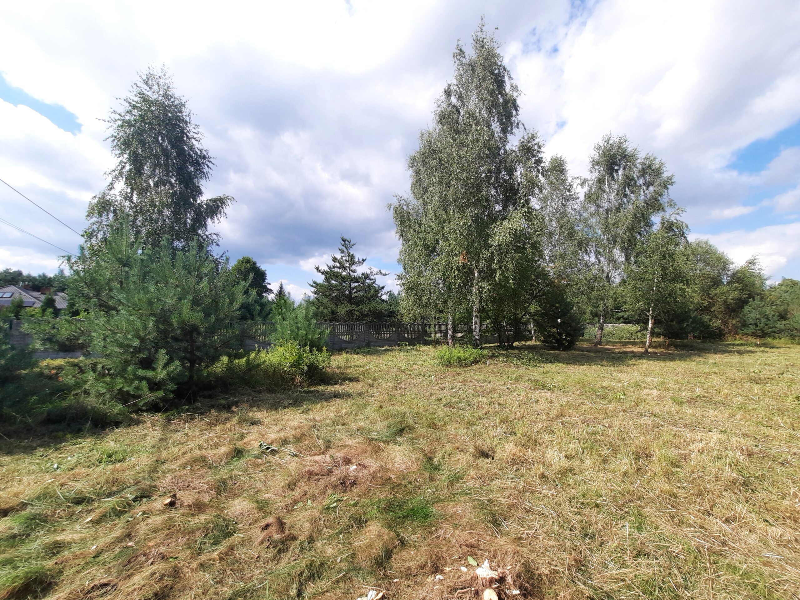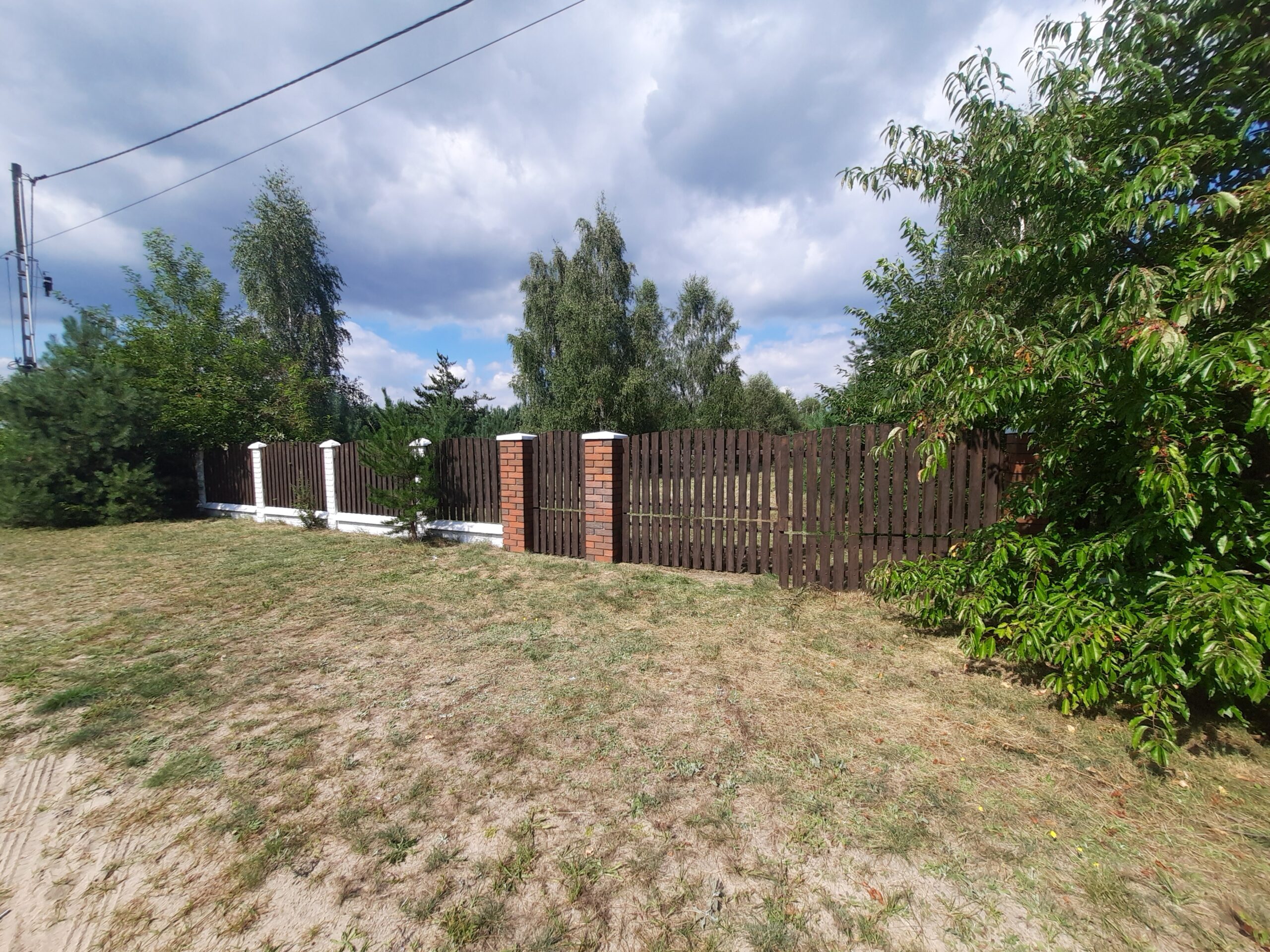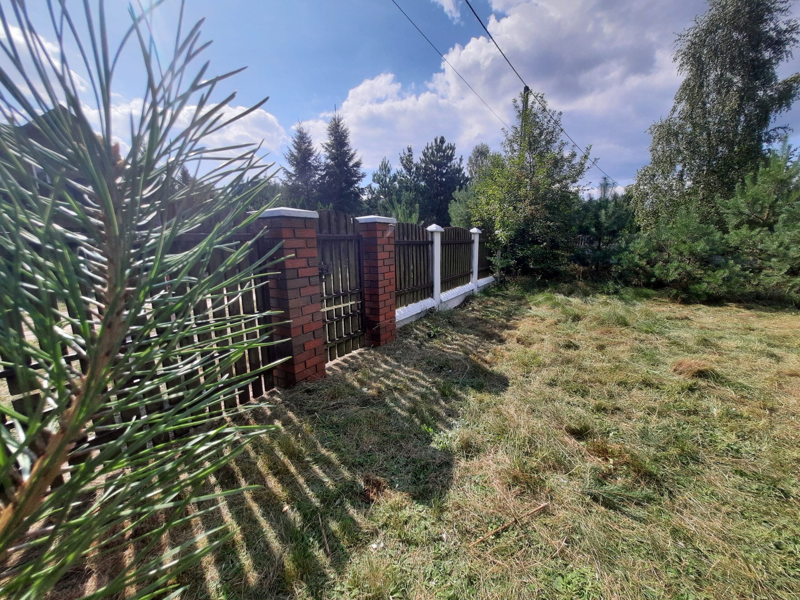 Działka częściowo zalesiona sosenkami i brzózkami, ogrodzona z każdej strony solidnym betonowym ogrodzeniem, natomiast front z elementami drewna i bramą wjazdową dodaje klimatu.