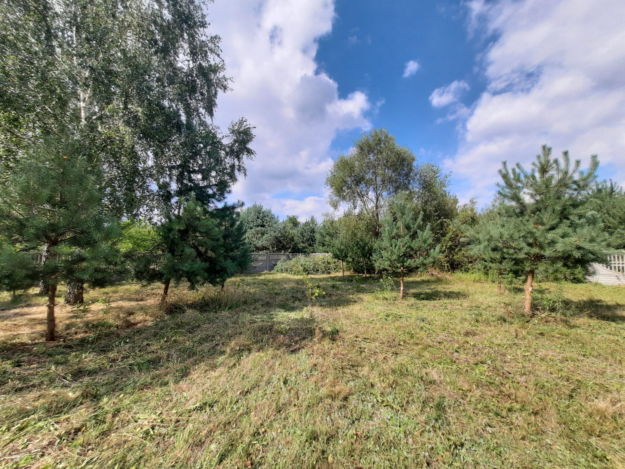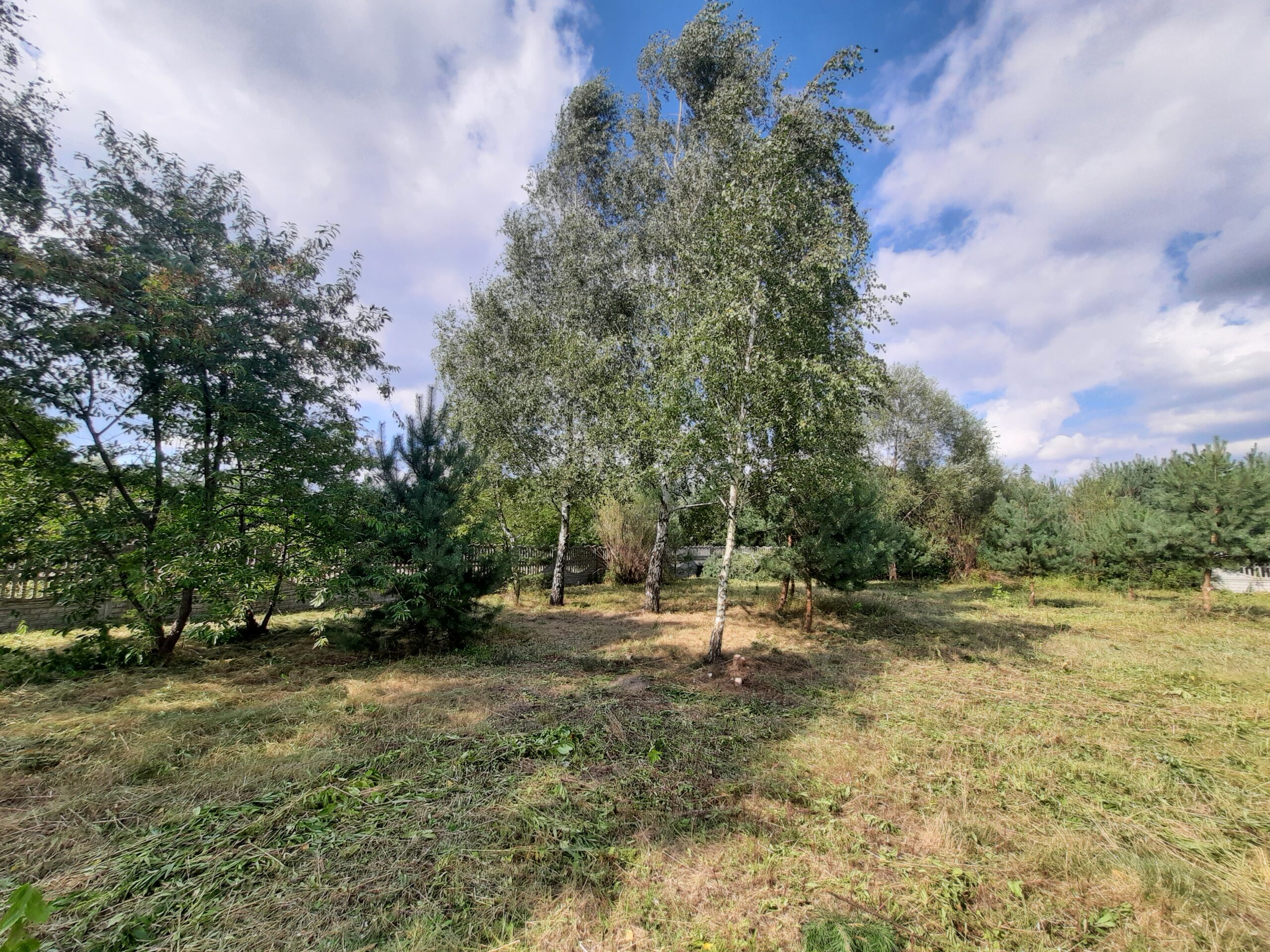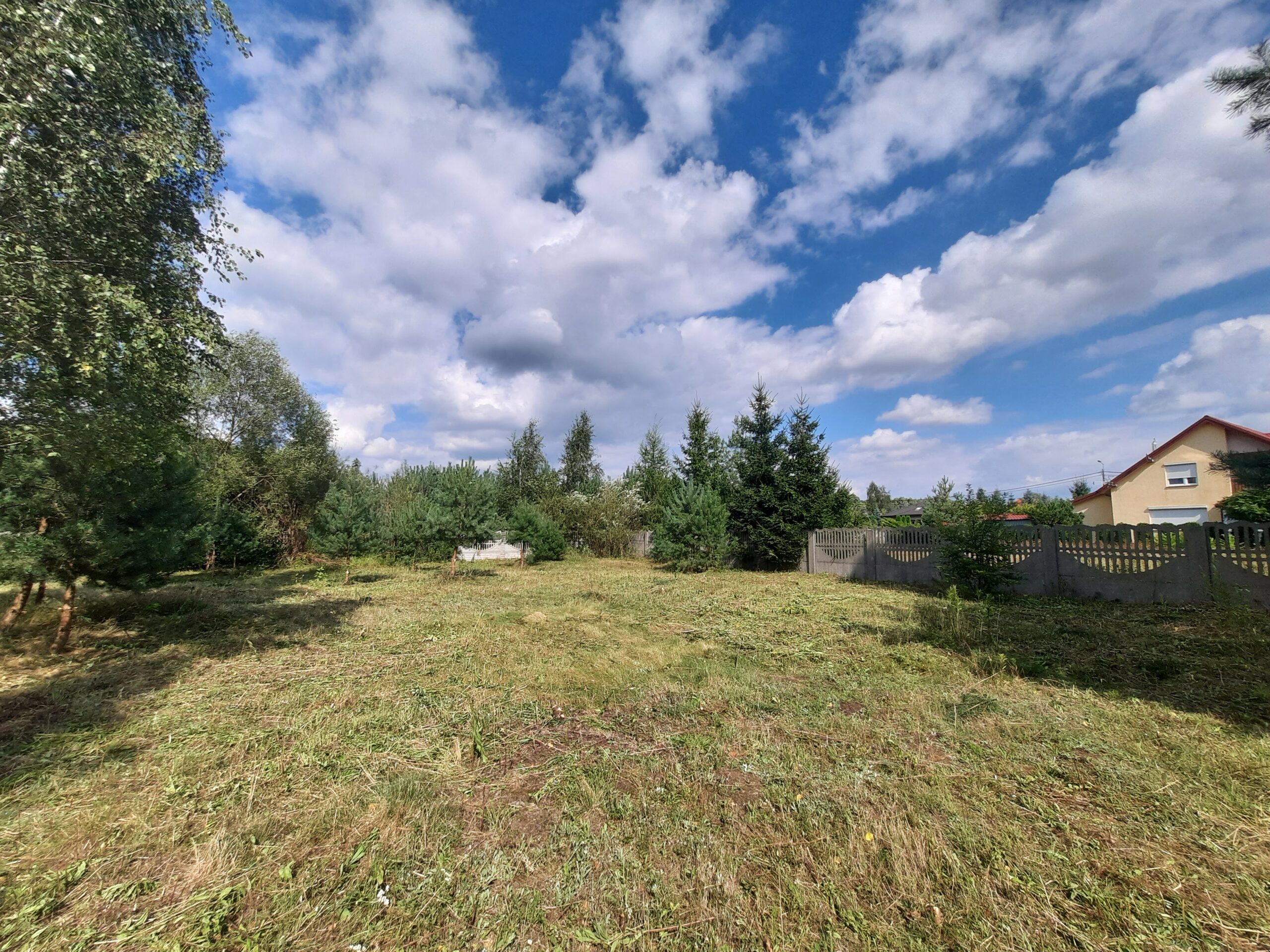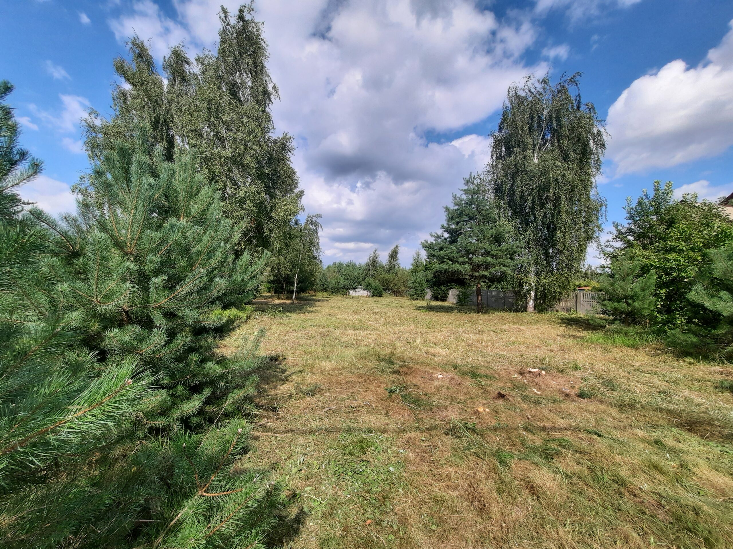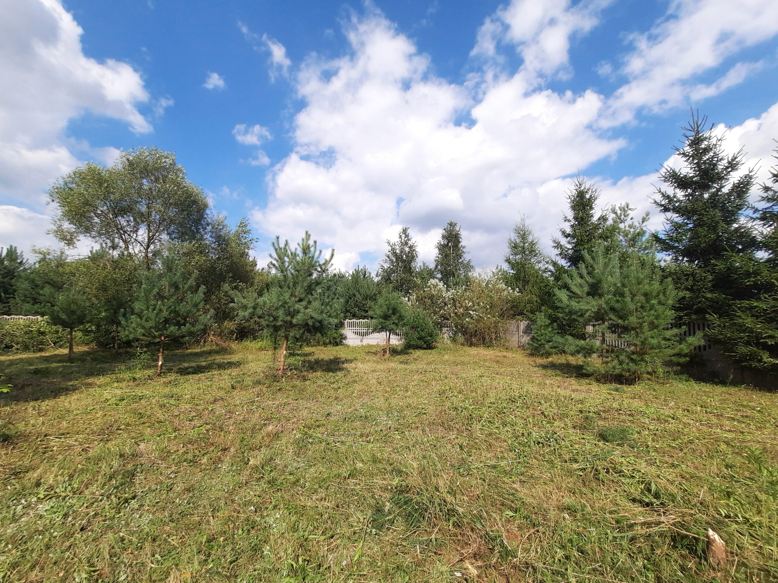 Działka częściowo zalesiona sosenkami i brzózkami, ogrodzona z każdej strony solidnym betonowym ogrodzeniem, natomiast front z elementami drewna i bramą wjazdową dodaje klimatu.